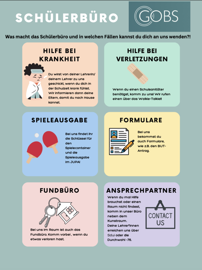 Das Schülerbüro ist eine hervorragende Möglichkeit, um Schüler*innen in die Gestaltung ihres Schullebens einzubinden und ihnen gleichzeitig die Möglichkeit zu geben, ihre Selbstständigkeit und Verantwortungsbereitschaft gegenüber Mitschüler*innen und der eigenen Schule zu stärken. Dieses Engagement wird von den Lehrkräften honoriert und auf den LEBs explizit herausgestellt werden.